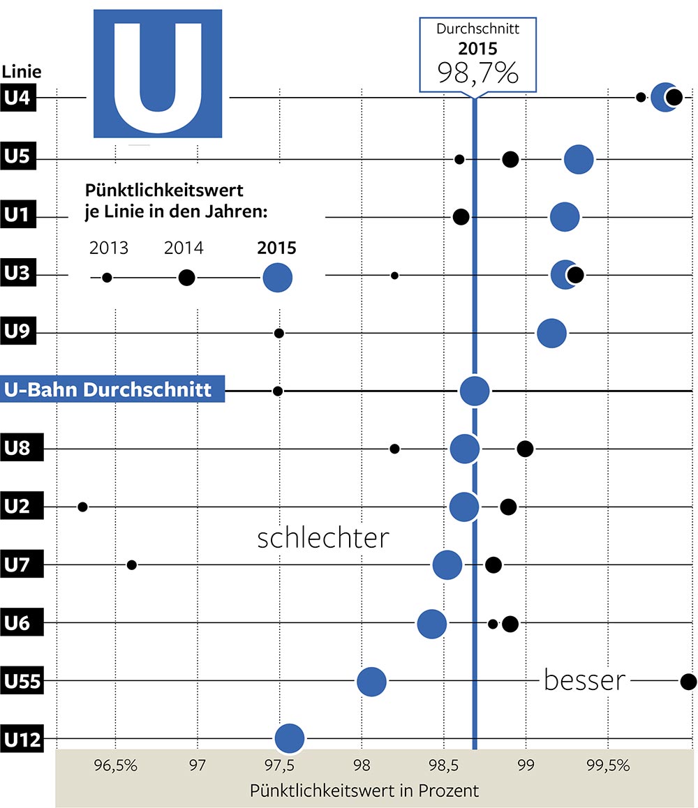 Von dieser Bewertungsmethode profitiert vor allem die U-Bahn, die wegen ihres separaten Netzes vergleichsweise immun ist gegen äußere Störungen. So schaffen aktuell alle neun U-Bahn-Linien locker, die einst im Verkehrsvertrag des Senats mit der BVG eingetragene Pünktlichkeitsvorgabe von 97 Prozent zu erfüllen. Spitzenreiter ist dabei die U4. Auf der nur 2,9 Kilometer langen Strecke zwischen Nollendorfplatz und Innsbrucker Platz fahren die Züge nur zu 0,1 Prozent mit Fahrplanabweichung. Im Ranking folgen die U5 (Alexanderplatz–Hönow) mit 0,7 Prozent und gleichauf die U3 (Nollendorfplatz–Krumme Lanke) und – etwas überraschend – die U9 zwischen Rathaus Steglitz und Osloer Straße mit jeweils nur 0,8 Prozent verspäteter Zugfahrten.