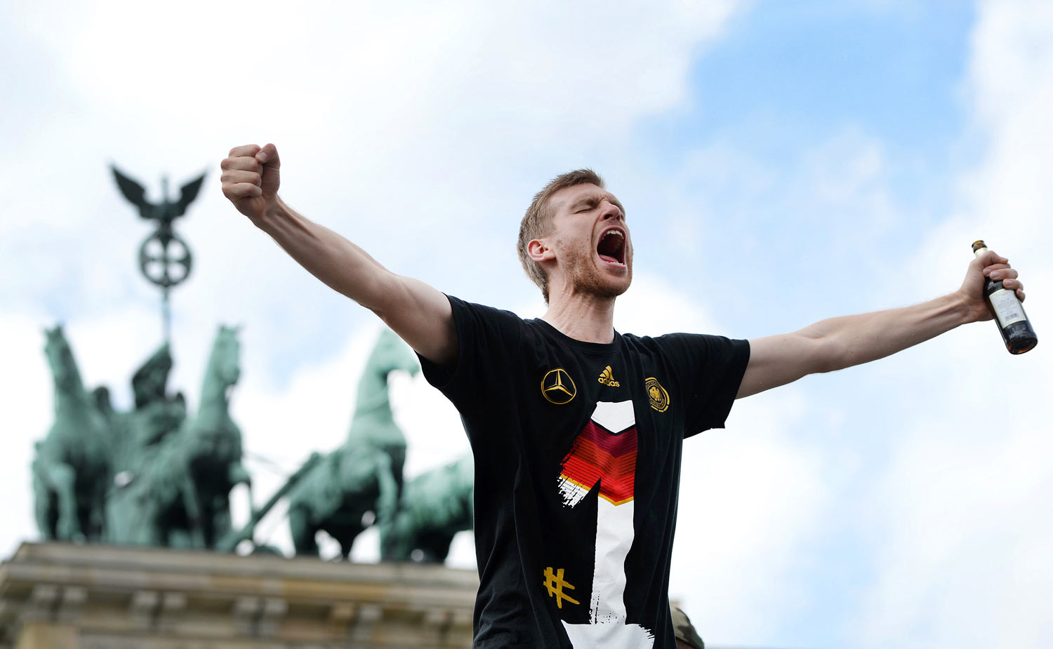 9Endlich angekommen: Per Mertesackers Urschrei am Brandenburger Tor. Foto: Daniel Naupold, dpa