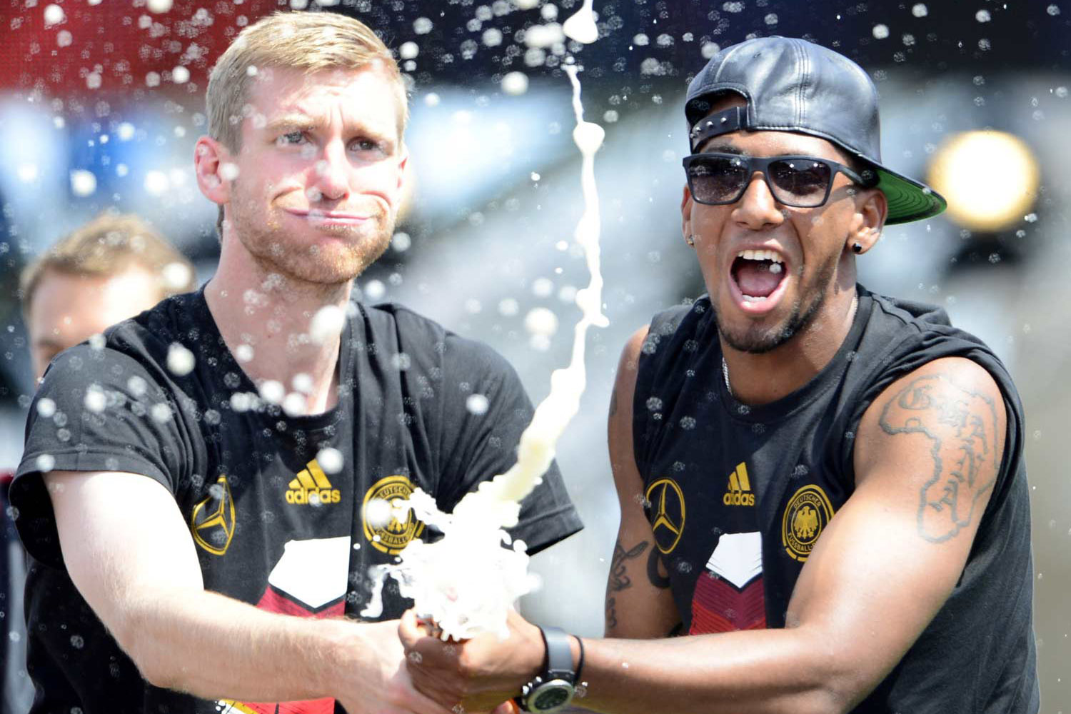 13Die Korken knallen: Per Mertesacker (l.) und Berlins Bester, Jerome Boateng. Foto: Robert Michael, AFP