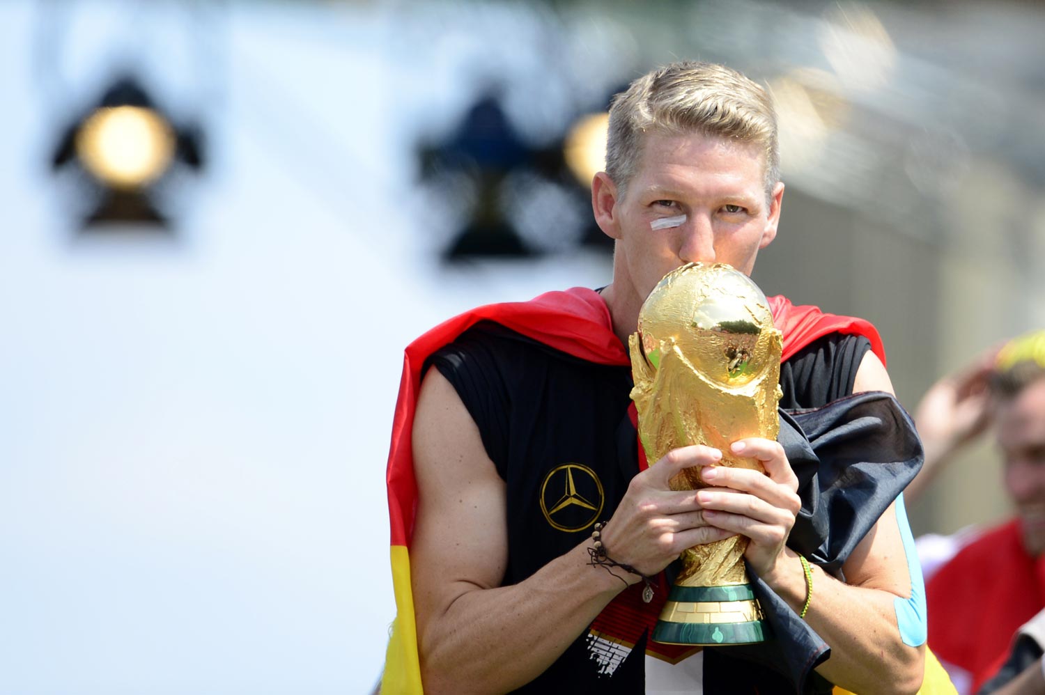 16Gezeichnet vom Finale gegen Argentinien: Bastian Schweinsteiger knutscht den Pokal. Foto: Robert Michael, AFP
