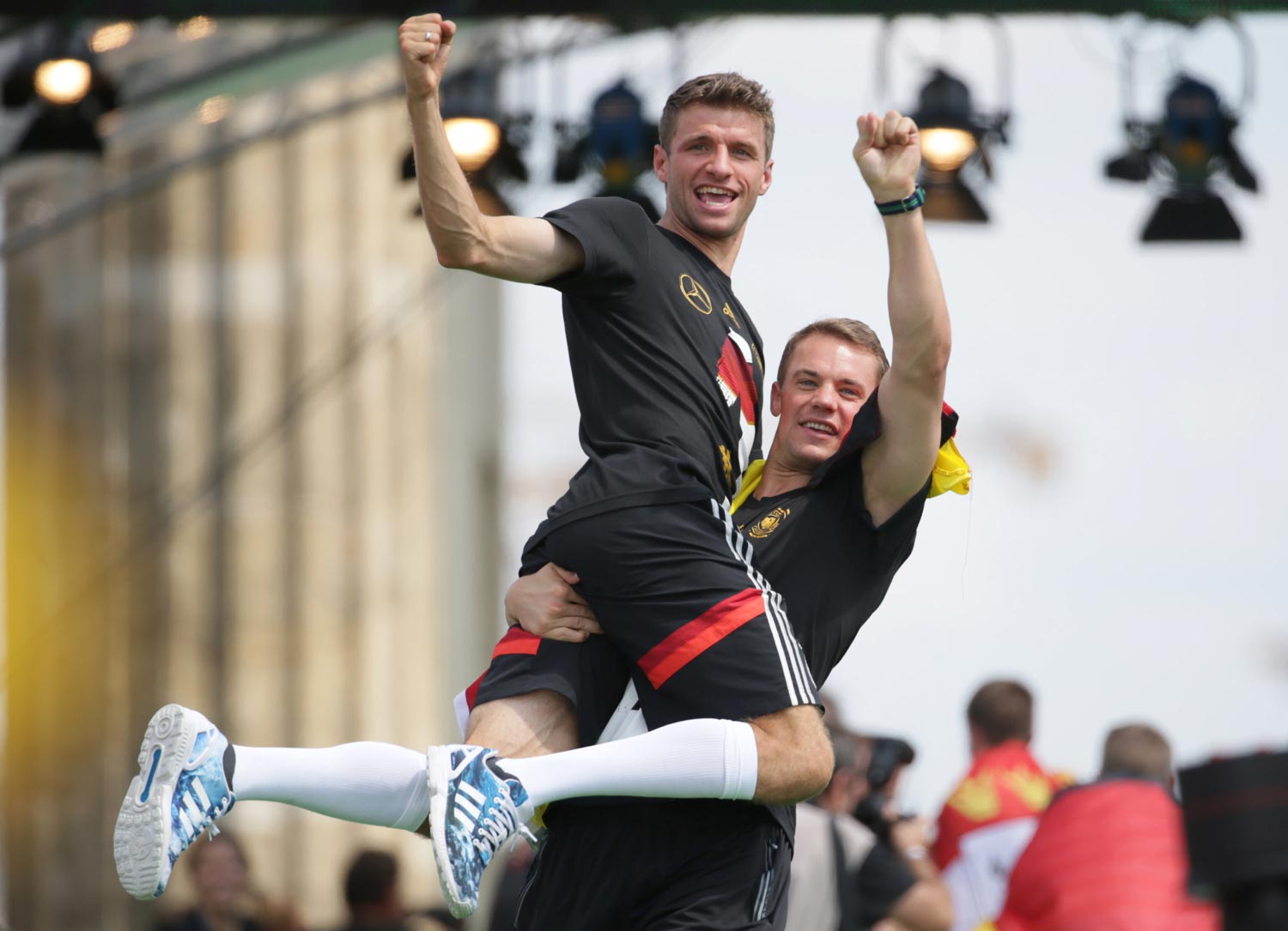 14Auf den Arm genommen: Der beste deutsche Torschütze mit dem besten Torhüter der Welt Thomas Müller (l.) und Manuel Neuer. Foto: Michael Kappeler, dpa
