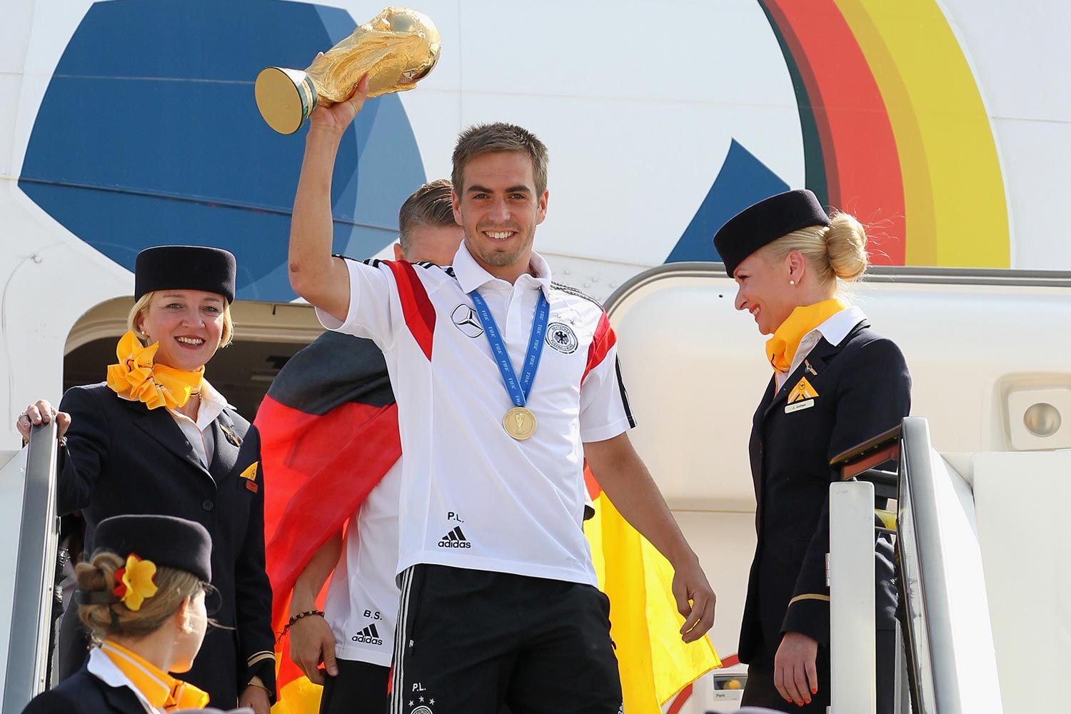 5Der Pokal ist wieder in Deutschland: Kapitän Philipp Lahm steigt als erster aus - und hat etwas mitgebracht. Foto: Karina Hessland, Bongarts, Getty Images
