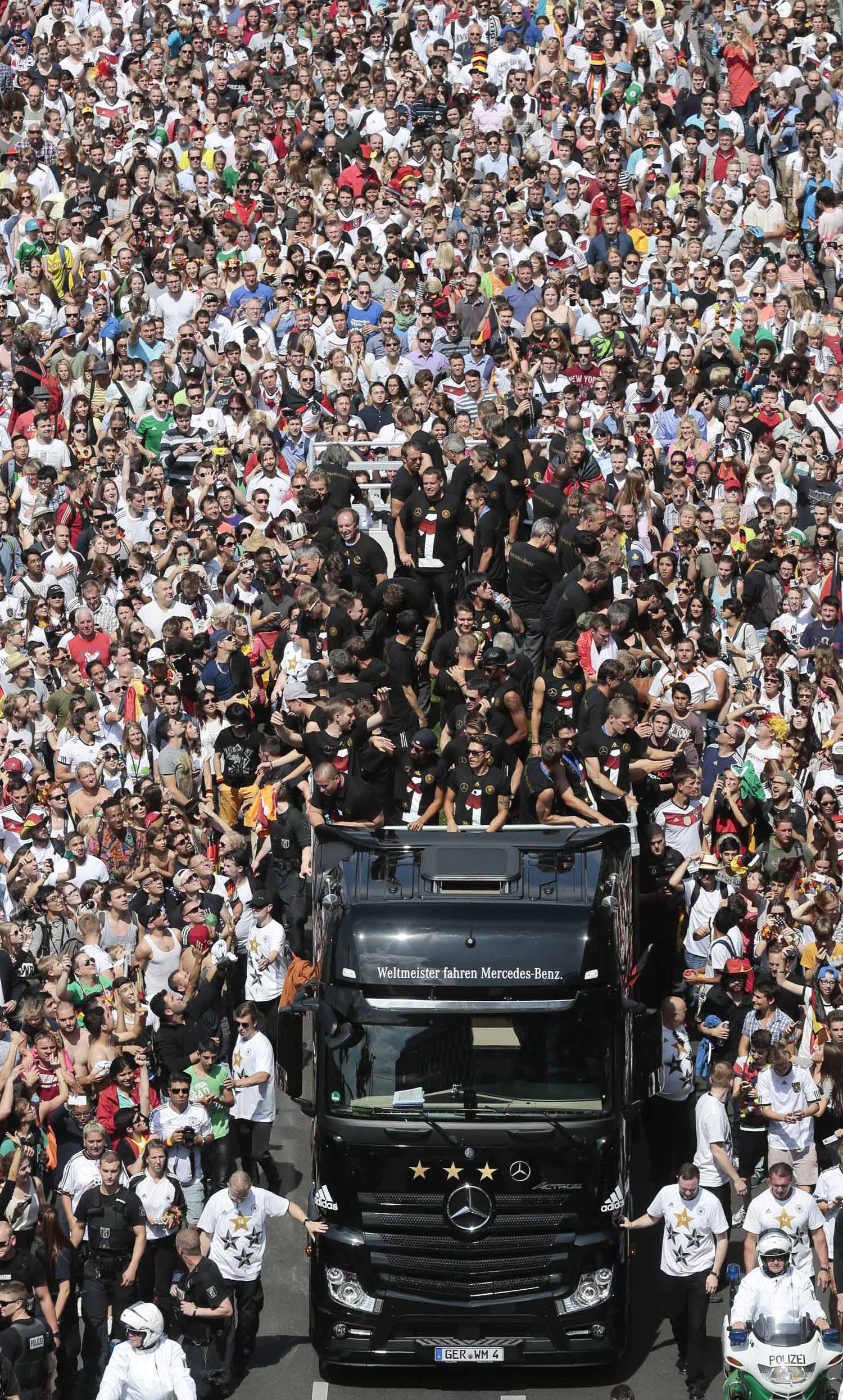 10Historischer Augenblick: Eine Million Menschen empfangen die Weltmeister in Berlin, davon jeder zweite auf der Fanmeile. Foto: Michael Kappeler, dpa